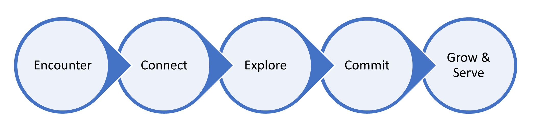The discipleship Journey shows how we love to journey with people towards a relationship with God, Encountering new people, Connecting with one another, Exploring faith and community and hopefully Committing to follow God. Then, we all continue to grow and serve Him together.